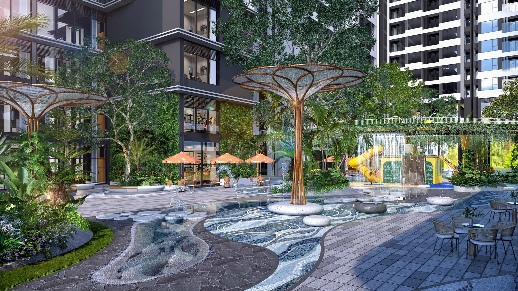 Với thiết kế phân tầng cao độ, cảnh quan tại La Pura mở ra tầm nhìn thoáng rộng, hài hòa giữa mỹ quan và công năng phục vụ. Chuỗi tiện ích được đan cài giữa những mảng xanh, xóa mờ khoảng cách giữa nhân tạo và tự nhiên. Dọc theo dòng suối nhiệt đới dài 300m, các tiện ích và cảnh quan được kết nối xuyên suốt mang đến không gian xanh tiện nghi và thư giãn.