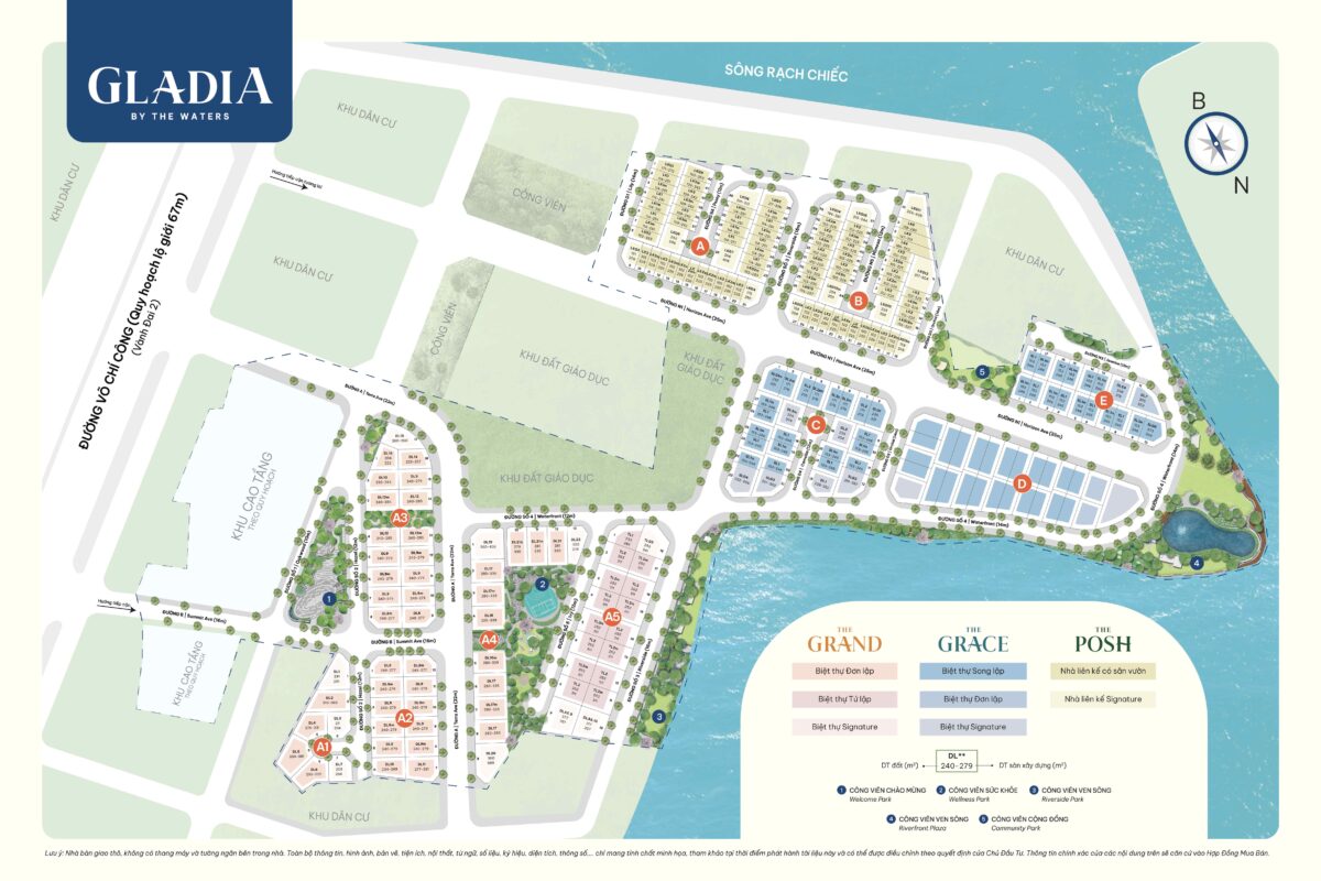 Mặt bằng căn biệt thự đơn lập và song lập được triển khai với quỹ đất rộng 5.8 hecta được quy hoạch thành 5 phân khu gồm: Khu A, khu B, Khu C, khu D và khu E, dự án sẽ cung ứng ra thị trường với 159 sản phẩm loại hình nhà phố và biệt thự. Bên cạnh đó phần diện tích mảng xanh tại dự án chiếm hơn 62% tổng thể quy mô. Với tầm nhìn hướng sông xanh mát cùng với công viên dọc bờ sông trải dài gần 1km, cư dân Gladia sẽ có cơ hội sinh sống trong một khu sân vườn có thể nói là lớn nhất đối với các dự án có cùng quy mô. Chính vì vậy, gần như toàn bộ cư dân sẽ được tận hưởng bầu không khí trong và gió trời dịu mát từ hệ thống cây xanh dày đặc.