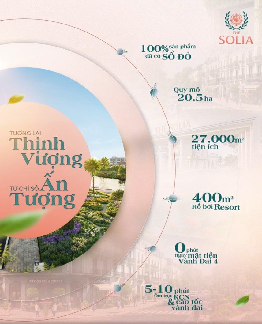 The Solia là khu đô thị quy mô rộng lớn, được quy hoạch bài bản trên diện tích 20,5ha với gần 1.000 sản phẩm đất nền sổ đỏ riêng biệt. Dự án đảm bảo pháp lý minh bạch và hoàn thiện cơ sở hạ tầng hiện đại, tạo nền tảng vững chắc cho một cộng đồng dân cư phát triển bền vững và thịnh vượng.