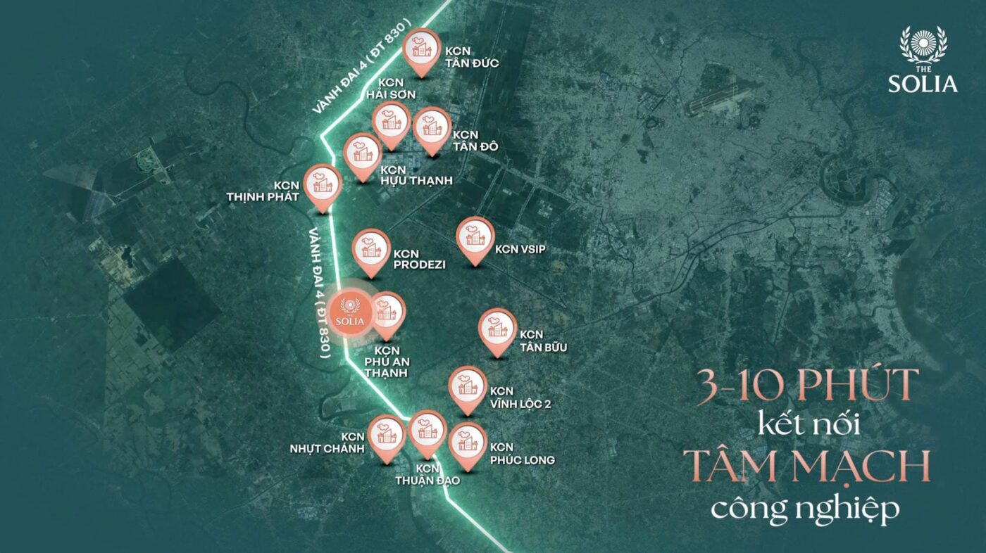 Tọa lạc ngay mặt tiền đại lộ ĐT824 – tuyến huyết mạch kết nối Bến Lức với TP.HCM, The Solia hiện lên như một bản giao hưởng của nhịp sống hiện đại và thiên nhiên thanh bình. Trên quy mô hơn 20,5 ha, khu đô thị được quy hoạch đồng bộ với gần 1.000 sản phẩm đất nền bến lức, nhà phố, biệt thự cùng hệ tiện ích đa dạng và mảng xanh dày đặc. Dưới bàn tay của Thịnh Hưng Holdings, The Solia là nơi mỗi cư dân có thể lắng nghe và tự mình viết nên cuộc sống riêng đầy cảm hứng.
